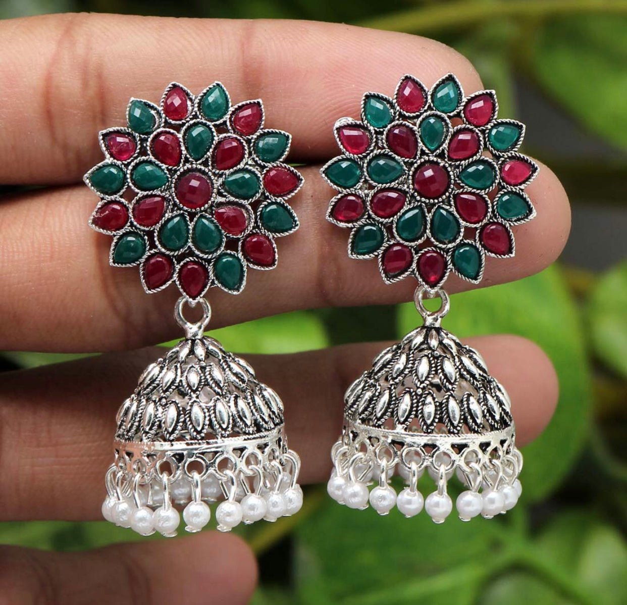 • Maroon & Green Color Glass Stone Oxidised Earrings